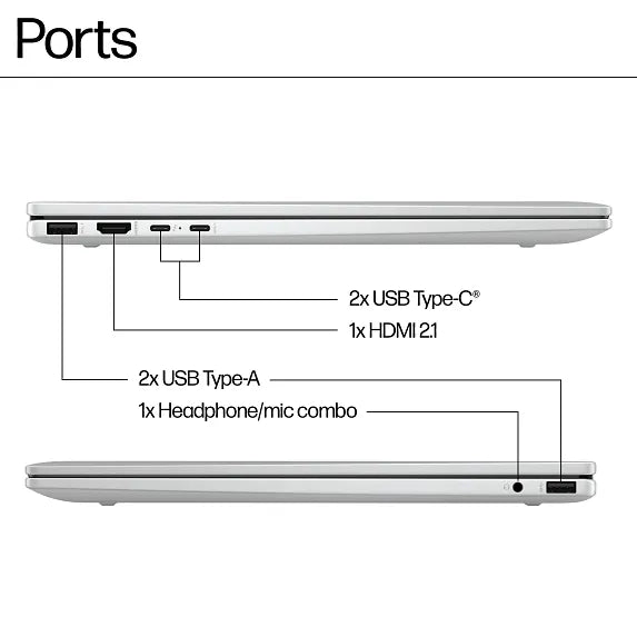 1 USB Type-A 10Gbps signaling rate; 1 USB Type-A 10Gbps signaling rate (HP Sleep and Charge); 2 Thunderbolt™ 4 with USB Type-C® 40Gbps signaling rate (USB Power Delivery, DisplayPort™ 1.4, HP Sleep and Charge); 1 HDMI 2.1; 1 AC smart pin; 1 headphone/microphone combo
